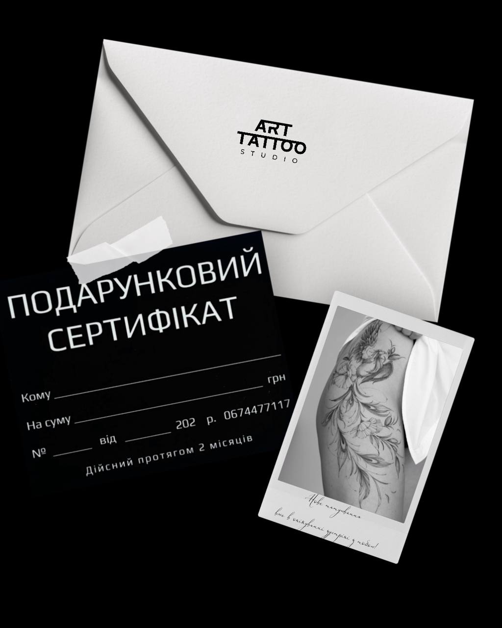 Сертифікат діє на всі послуги студії: татуювання, пірсинг, перманент, лазерне видалення та навчальні курси.